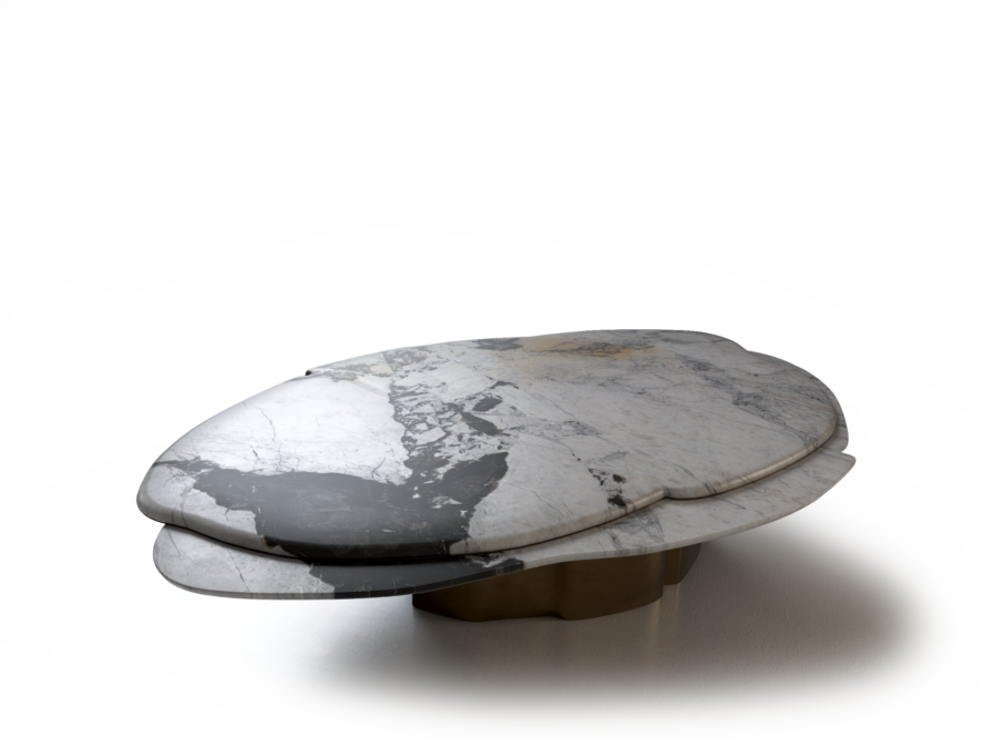 The OYSTER I is a refined, sculptural center set of two coffee tables, tastefully blends the strength of natural marble with the warmth of solid brass in “antique satin” finish.