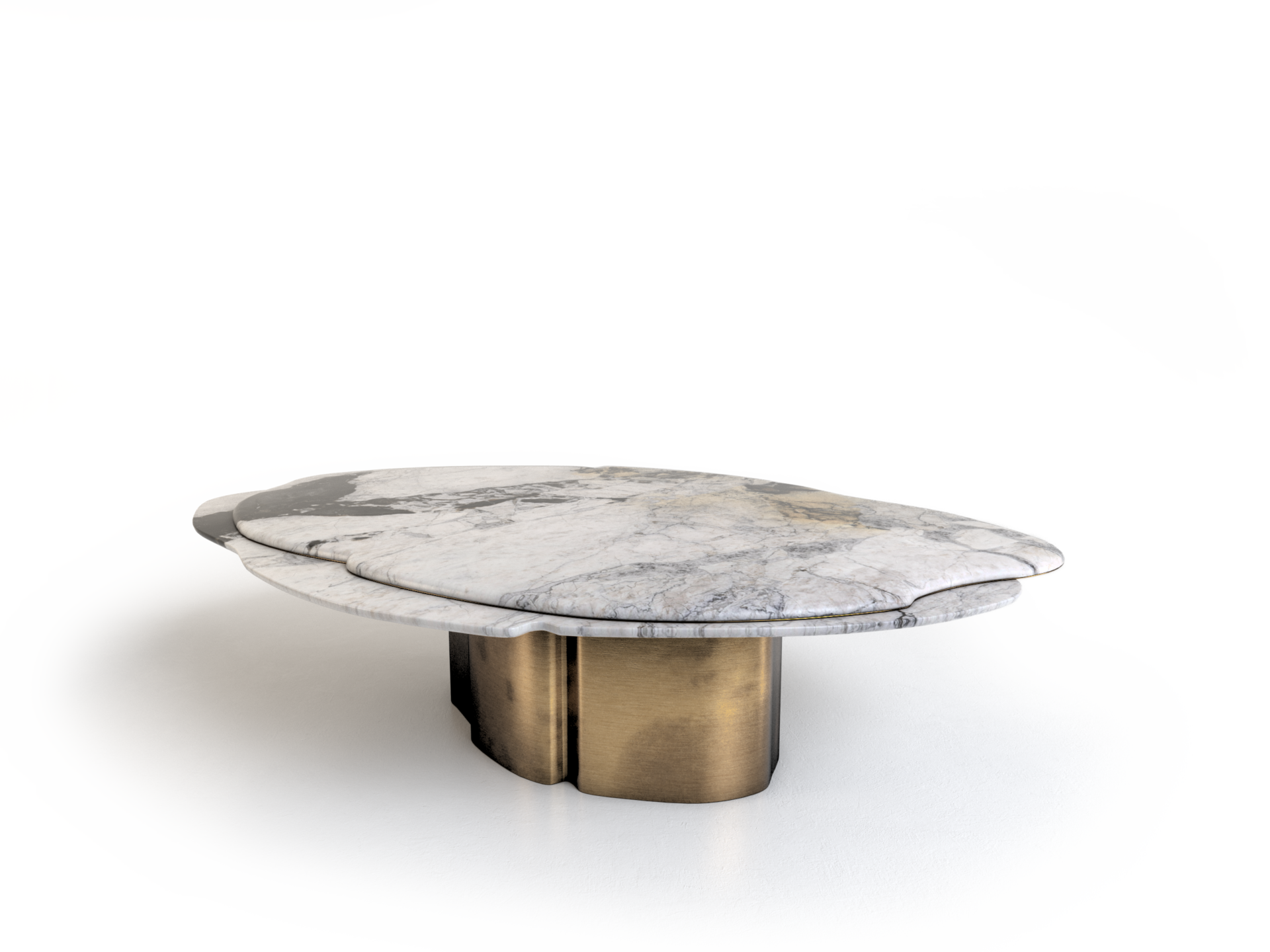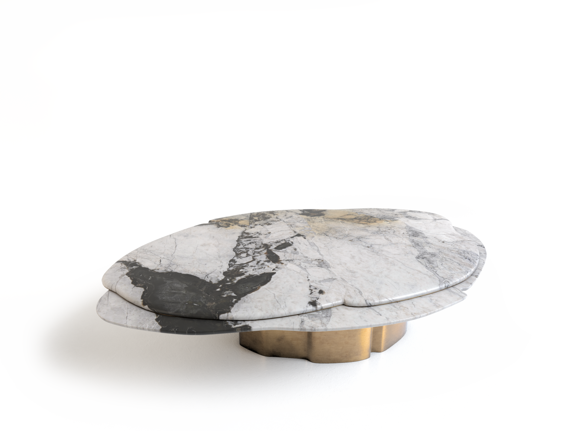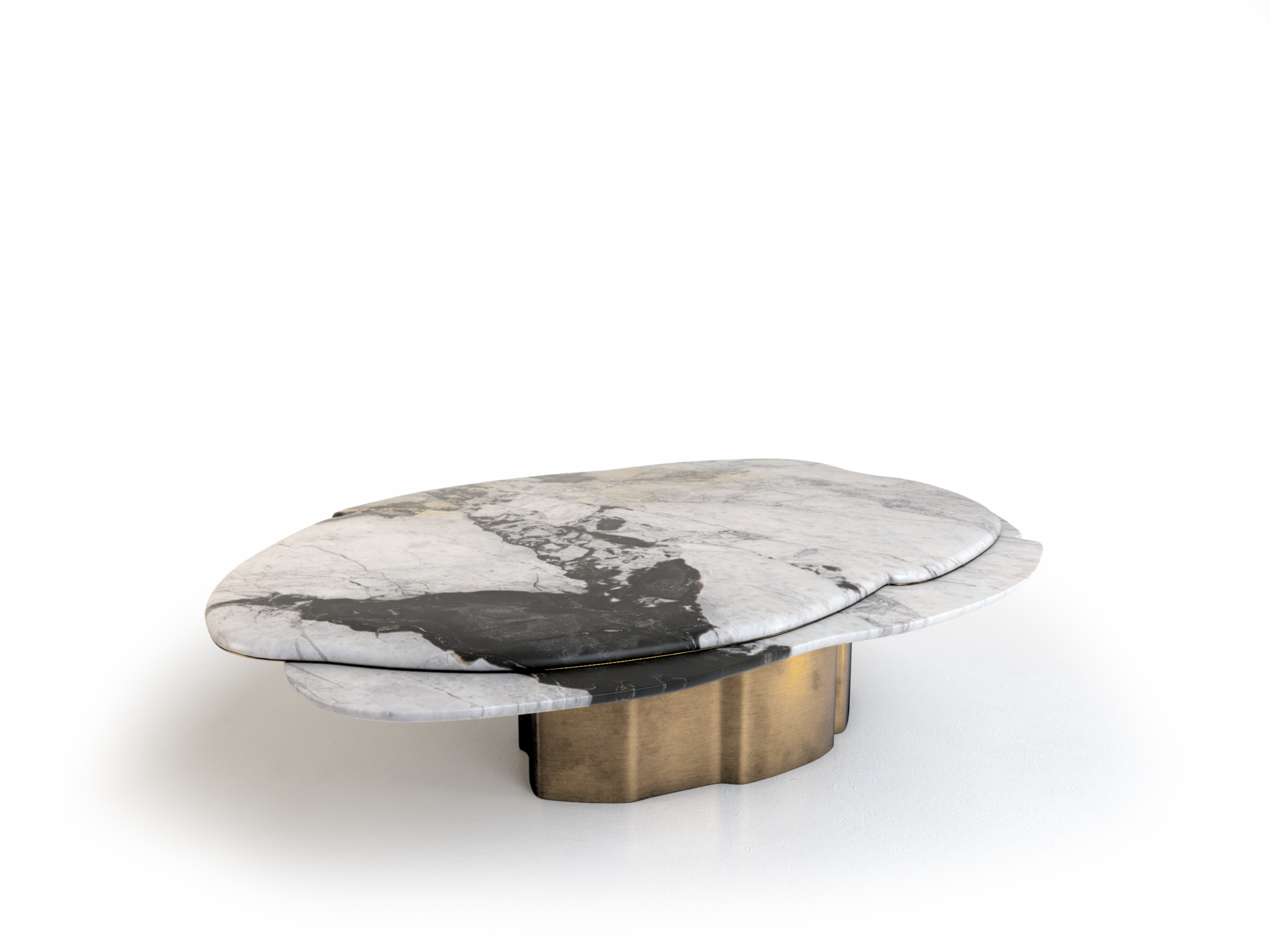 The OYSTER V is a refined, sculptural center piece, tastefully blends the strength of natural marble with the warmth of solid brass in “dark antique satin” finish.